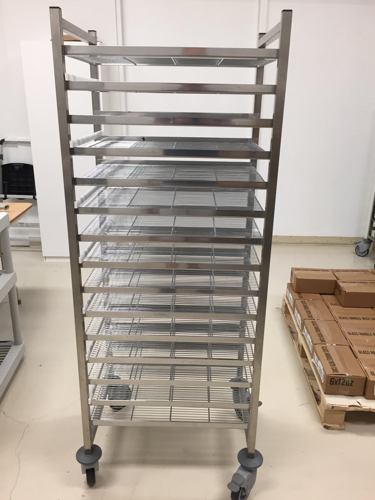 - French stainless steel trolleys from Bourgeat; purchased from Chocolate World in Belgium; 15 shelves each, grills included.