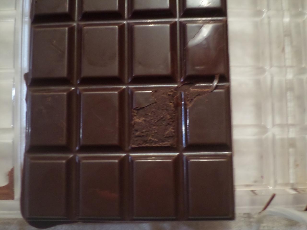 As you can see on the pictures, the chocolate adheres on some small areas of the moulds, living an ugly look to the bar. I don't think it's a tempering problem, as 1/ I'm using a tempering machine that does the job perfectly, 2/ not all the bars of the same mould have this.