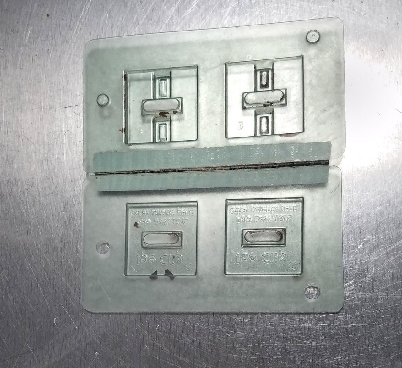 I recently took over a business from a local chocolatier and have been asked to repeat job that the previous owner has done for the past 2 years. The company makes a widget, and has it recreated in molds (see attached). The molds come is two pieces and fit together. The previous owner had duck-taped a hinge along one side - which can't be hygienic, but while they fit together, they don't stay together (if that makes sense).